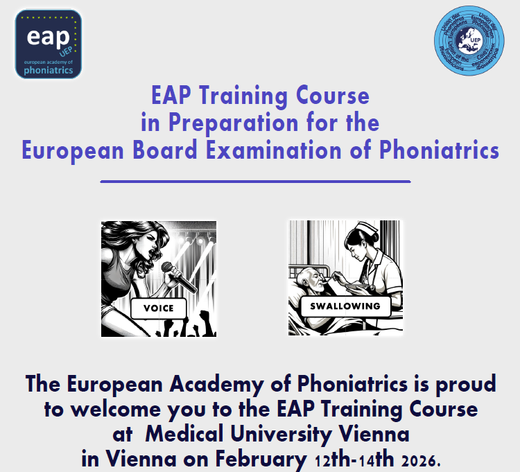 « All Events EAP Training Course in Preparation for the Eauropean Board Examination of Phoniatrics February 12, 2026 - February 14, 2026 « 13th Winter Meeting on Otology 6th Pan-European Voice Conference (PEVOC 16) & Voice Istanbul 2026 » Add to calendar Google Calendar iCalendar Outlook 365 Outlook Live Details Start: February 12, 2026 End: February 14, 2026 Event Category: UEP Events Website: https://uep.phoniatrics.eu/eap-course-upcoming-meetings/ Organiser EAP -European Academy of Phoniatrics Venue Jugendstil Lecture Hall of the Medical University of Vienna, Austria Vienna, Austria + Google Map